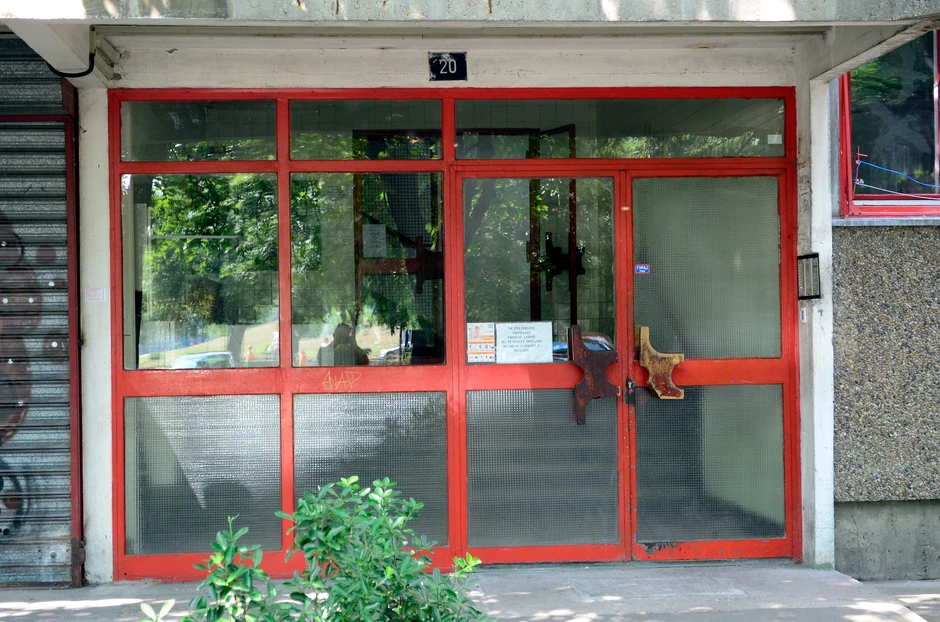 Na jednoj zgradi stoji zalepljena poruka u kojoj se apeluje na stanare da budu ljudi i ne isteruju psa napolje.