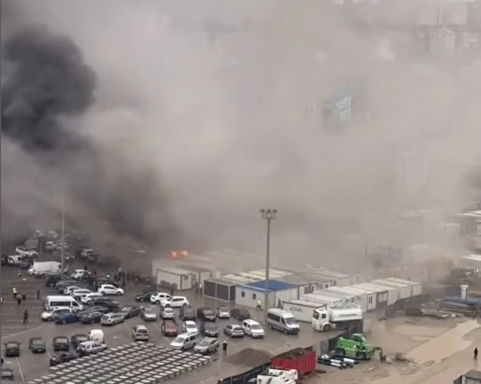 Na snimku se vidi kako dim kulja na sve strane i kako gori nekoliko radničkih kontejnera.