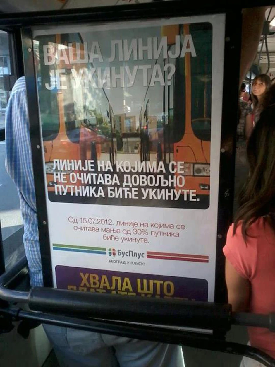 Mnoge Beograđane naljutili su posteri "Bus plusa" okačeni u vozila gradskog prevoza, na kojima piše da će "linije na kojima se ne očitava dovoljno putnika biti ukinute". Ipak, član Gradskog veća Željko Ožegović kaže da isključivo Direkcija za javni prevoz može da odluči o izmenama u javnom saobraćaju.