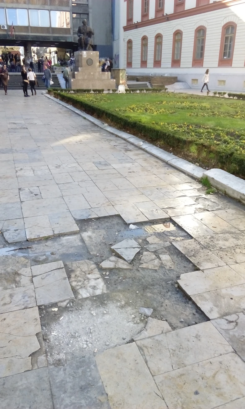 Pored pločnika uništene su i klupe oko Njegoševe biste. Na metar od ruiniranog poda nalazi se i stajalište za autobuse i trolejbuse, pa građani redovno preskaču ili zaobilaze rupe, dok drugi slikaju polomljene ploče.