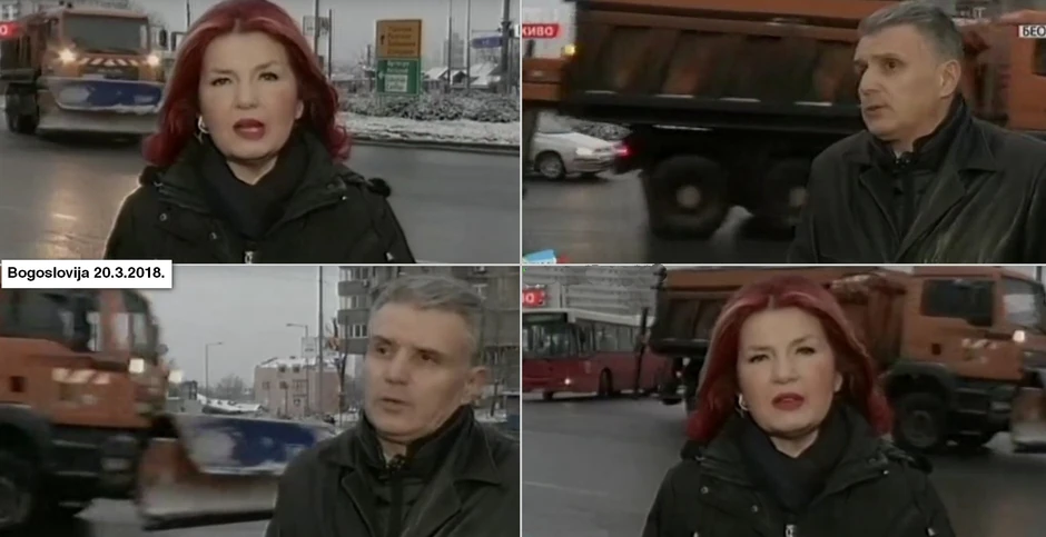Voditeljka RTS-a juče se nešto posle šest sati, u Jutarnji program uključila sa kružnog toka na Bogosloviji, gde je o radu zimske službe "Beograd puta" razgovarala sa dežurnim inženjerom ovog preduzeća Obradom Simićem.