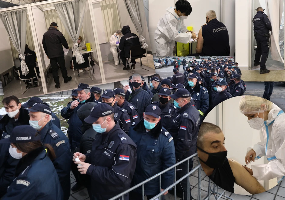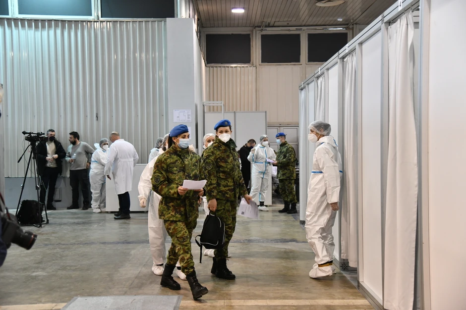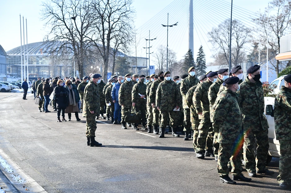 Dugačak red uniformisanih ljudi čekao je ispred Beogradskog sajma, uz smeh i poneku grudvu, da uđu i prime vakcinu protiv korona virusa.