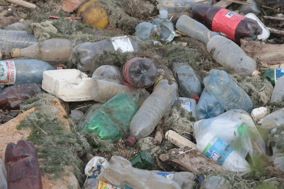 Duž celog rukavca nalaze se plastične flaše, kese sa smećem, đubre...