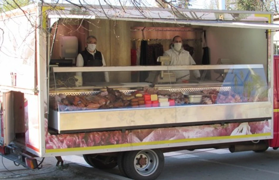 Kamion je u stvari preuređena hladnjača za transport mesa od koje je sada nastala prava mala mesara, gde iza vitrine rade dvojica mesara pod adekvatnom zaštitom predviđenom za doba epidemije.