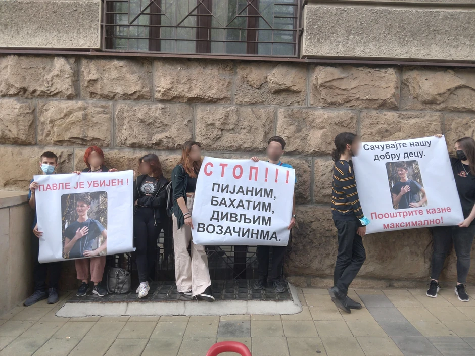 Porodica je na današnje suđenje došla u majicama sa Pavlovim likom, a njegovi drugari iz odeljenja su doneli transparente da pruže podršku roditeljima i bratu svog ubijenog druga. "Stop pijanim, bahatim, divljim vozačima!", "Pavle je ubijen!", "Sačuvajte našu dobru decu! Pooštrite kazne maksimalno!", neki su od natpisa na transparentima koje su nosili.