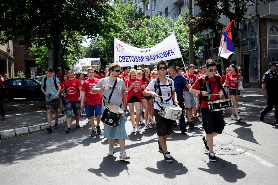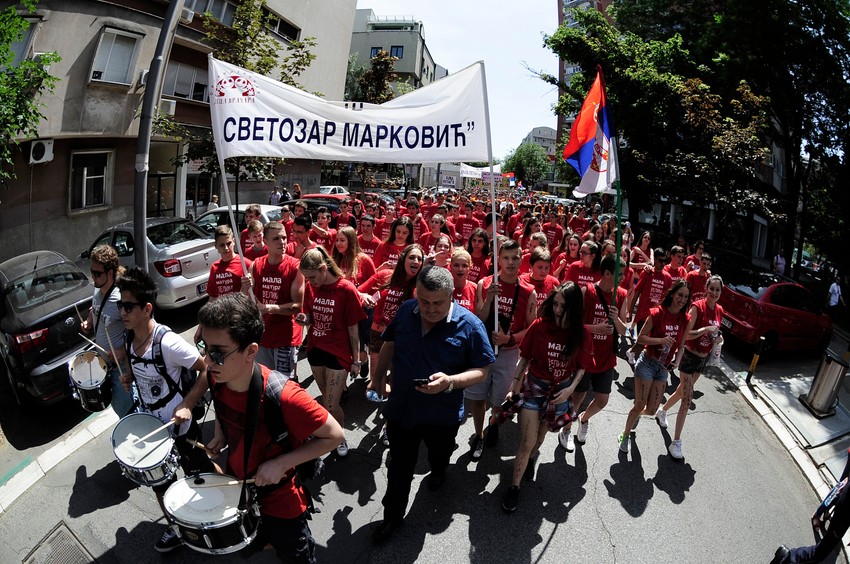 Bubnjevi, graja, osmesi, šarene majice i kolona nasmejanih lica otvorili su defile malih maturanata opštine Vračar. Oni su danas za kraj školske godine prošetali od Beogradskog dramskog pozorišta do Cvetnog trga.