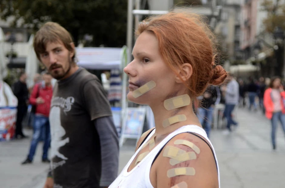 Tačno u šest sati na sred Trga republike stala je devojka prekrivena ranama. Prolaznici su za trenutak zastajali. Otvoreno su gledali u modrice i nijanse ljubičastog, teget i crvenog. Građani počeli da prilaze devojci na ivici suza...