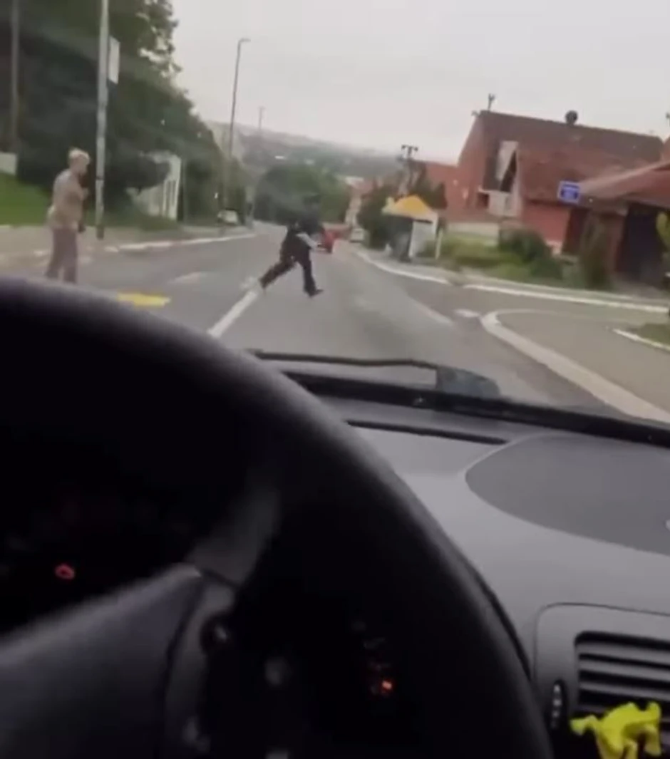 Vozač u tom trenutku naglo skreće na levo, srećom u suprotnoj traci nije bilo nikoga, i nastavlja dalje kao da se ništa nije desilo! Naravno, telefon ne ispušta iz ruku i nastavlja da snima.