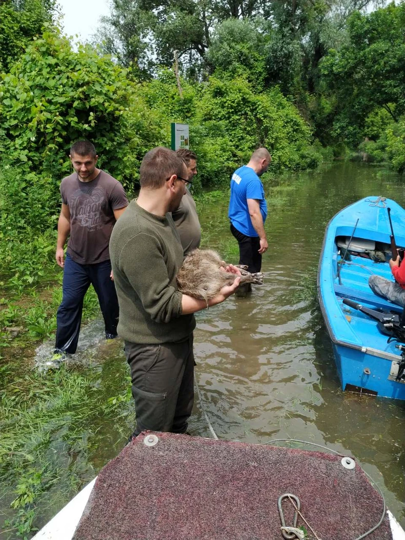 Za to vreme, upravnik lovišta „Donji Srem“ Nikola Vojinović i jedan radnik „Veterine“ iz čamca „Zelenila“ sa reke dvogledom pokušava da locira divlje svinje.