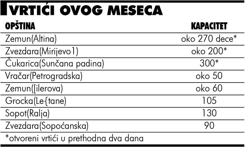 Već u ponedeljak, biće otvoreni vrtići u Šilerovoj i Petrogradskoj ulici u kućama koje su na osnovu Zakona o oduzimanju imovine stečene kriminalom oduzete Branislavu Uskokoviću, bivšem direktoru „EDB“ i Darku Šariću. U vili u Petrogradskoj biće samo jaslice za oko 50 najmlađih mališana dok će u Šilerovoj boraviti 60 dece svih uzrasta. Sledeći na spisku za otvaranje su novi vrtići u Leštanima i u Sopoćanskoj ulici na Zvezdari kao i nadograđeni deo u obdaništu u Ralji.