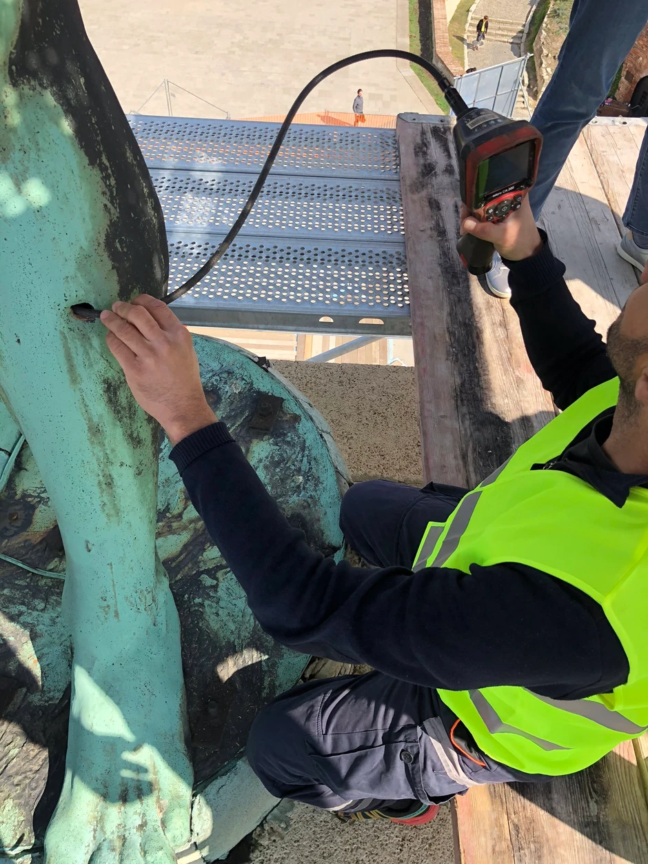 Rekonstrukcija spomenika "Pobednik" uveliko je u toku, a rezultati endoskopskog snimanja unutrašnjosti skulpture pokazali su da je on obezbeđen samo sa jednom čeličnom sajlom provučenom kroz noge.