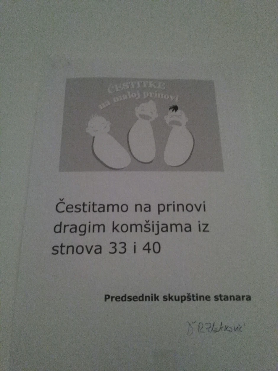 Dve porodice koje žive u Ulici Živka Davidovića na Zvezdari u petak, 19. februara, imale su najlepši razlog za slavlje. Naime, tog dana rodile su se dve bebe, iz dva stana, a komšije su im čestitku postavile - na ulazu od lifta.
