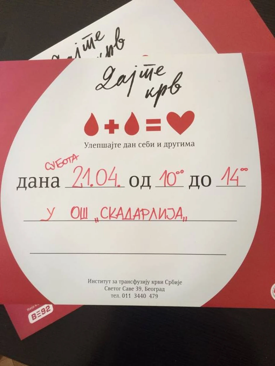 Akcija dobrovoljnog davanja krvi u subotu se od 10 do 14 sati organizuje u OŠ "Skadarlija".