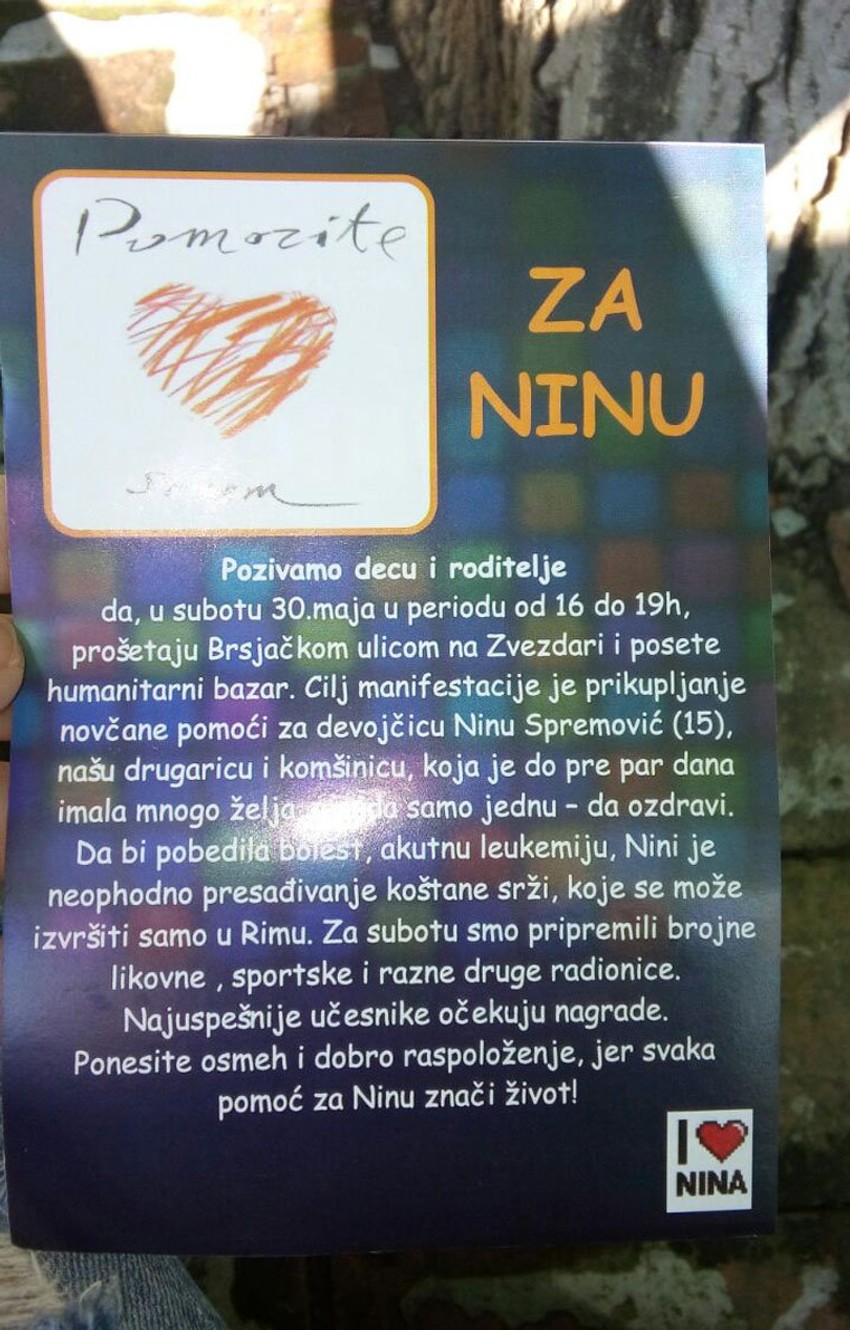 - Pozivamo decu i roditelje da u subotu u periodu od 16 do 19 sati prošetaju Brsjačkom ulicom na Zvezdari i posete humanitarni bazar. Cilj manifestacije je prikupljanje novčane pomoči za devojčicu Ninu Spremović (15), našu drugaricu i komšinicu, koja je do pre par dana imala mnogo želja a sada samo jednu - da ozdravi - napisale su komšije u pozivu.