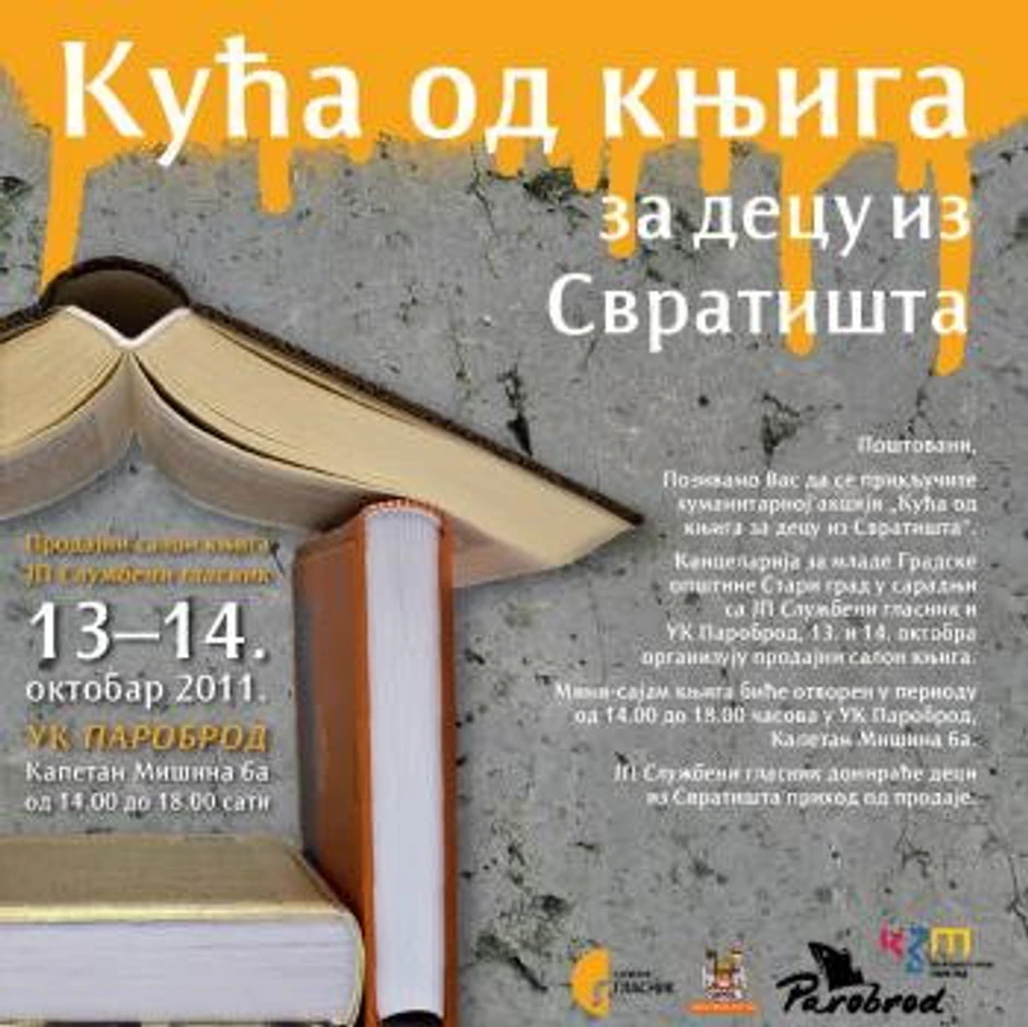 BEOGRAD - Kancelarija za mlade opštine Stari grad u Ustanovi kulture “Parobrod” (Kapetan Mišina 6a) organizovala je humanitarnu akciju “Kuća od knjiga za decu iz Svratišta” a prihod od prodatih knjiga je namenjen Centru za integracije mladih. Svi zainteresovani mogu i u subotu u periodu od 14 do 18 časova da kupovinom ili poklanjanjem svojih knjiga pomognu akciju.