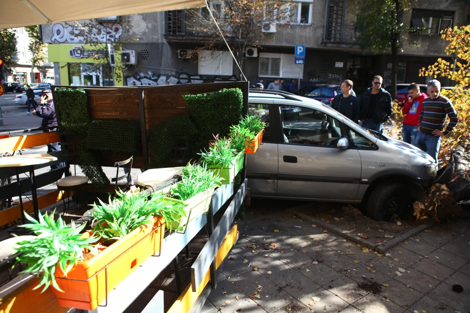 Kako javljaju reporteri "Blica" sa terena, za volanom automobila marke "opel zafira" nalazio se mlađi muškarac, očevici tvrde da se kretao prilinčo velikom brzinom, kao i da je u želji da izbegne parkirani kombi, udario u drvo i u baštu restorana. Kako kažu, da nije bilo šipki od bašte, automobil bi u velikoj brzini "pokupio" devojke koje su mirno ispijale kafu u bašti.