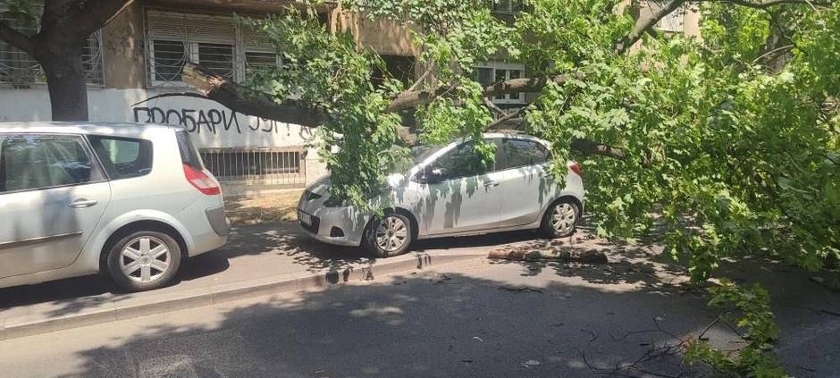 Na Karaburmi, u ulici Marijane Gregoran, u blizini jedne osnovne škole, danas je došlo do incidenta kada se drvo sručilo na parkirani automobil i potpuno ga uništilo.