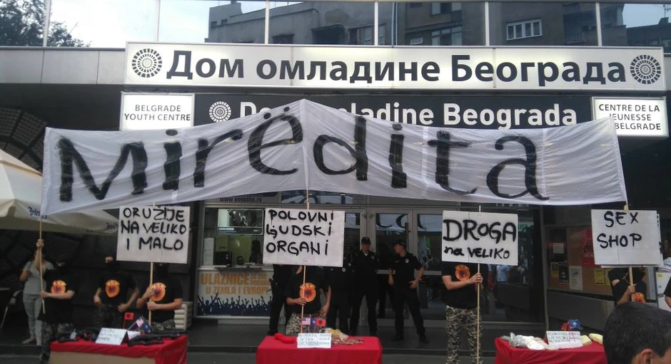 Nepoznati mladići, noseći fantomke sa transparentima i improvizovanim tezgama zauzeli su ulaz u Dom omladine, ali i vređali organizatore i posetioce na drugom danu festivala "Miridta, dobar dan".