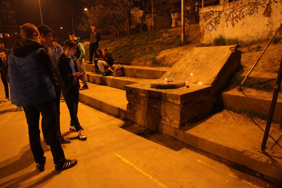 Na školskom dvorištu kasno sinoć okupljena deca i komšiluk. Tinjaju sveće na mestu gde je B.C. pao.