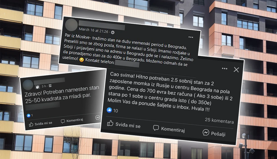 U drugom par iz Moskve kaže sledeće: "Tražimo stan na duži vremenski period u Beogradu. Preselili smo se zbog posla, firma se nalazi u Srbiji. Imamo rođake i prijavljeni smo na adresu u Beogradu gde se i nalazimo. Želimo da pronađemo stan do 400 evra u Beogradu. Možemo odmah da se uselimo!"
