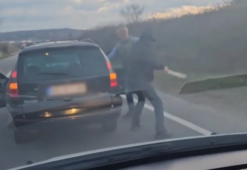 Žestoka tuča dvojice muškaraca zabeležena je danas na putu kod Ostružnice. Kako se vidi na snimku, muškarci su svađu započeli u automobilu, a onda su izašli napolje.