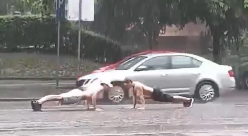 "Bulevar kralja Aleksandra na uglu Batutove", stoji u opsiu videa, u kom se može videti, kako dvojica muškaraca bez majica, u šorcevima i patikama, rade sklekove, ne obazući se na kišno vreme ali i na automobile koji su prolazili pored njih.