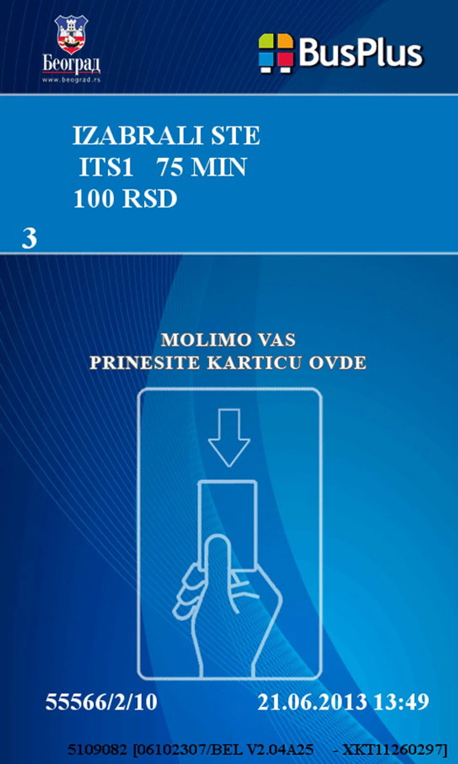 - Vreme važenje ove karte računa se od prvog očitavanja u vozilu. Prilikom tog očitavanja sa kartice se umanjuje iznos od 100 dinara, i na ekranu uređaja ispisuje vreme važenja karte kao i iznos preostalog kredita na kartici. Pri svakoj promeni vozila obavezno je ponovno očitavanje radi potvrde presedanja, što znači da putnik treba samo da prisloni svoju nepersonalizovanu karticu ekranu uređaja - objašnjavaju u “Bus plus”-u.