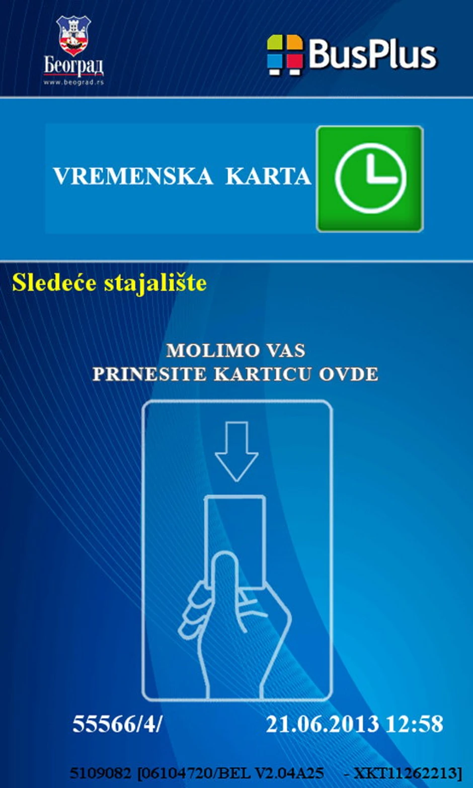 Vremenska “Bus plus” karta koja će moći da se koristi od ponedeljka po ceni od 100 dinara važiće 75 minuta, a putnici će je aktivirati tako što će na ekranu uređaja za očitavanje pritisnuti najpre ikonicu u obliku sata. Pošto se otvori meni na “displeju” putnik treba da izabere vremensku kartu u trajanju od 75 minuta i potom prisloni svoju nepersonalizovanu plastičnu ili papirnu karticu validatoru.