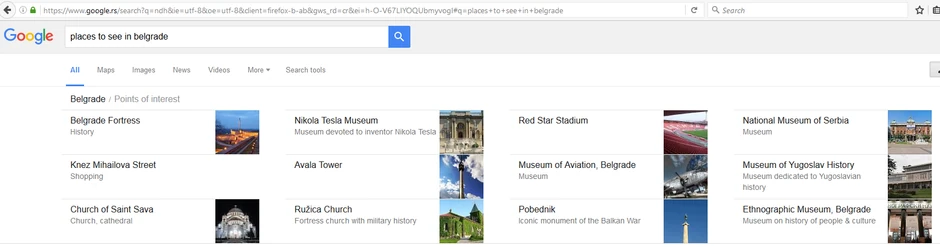 Evo šta se pojavljuje kada se ukuca "Šta videti u Beogradu?": Kalemegdanska tgvrđava, Muzej Nikole Tesle, Toranj na Avali, Nacionalni muzej, stadion Crvene zvezde, Hram Svetog Save, Zoološki vrt, Košutnjak, Beli dvor...