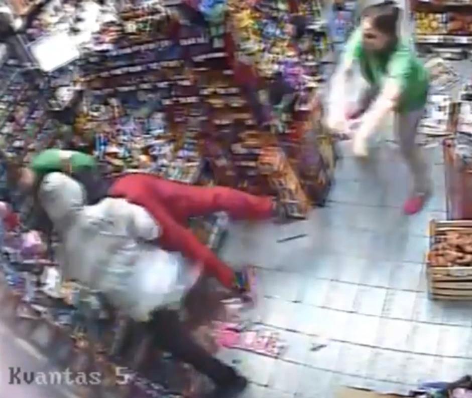 Na snimku se vide dvojica napadača sa maskama na licu, i nožem u ruci kako ulaze u radnju, a potom kako pokušavaju da uzmu novac iz kase, koju brani radnik za pultom, dok njegove koleginice za to vreme gađaju napadače čime god stigne.