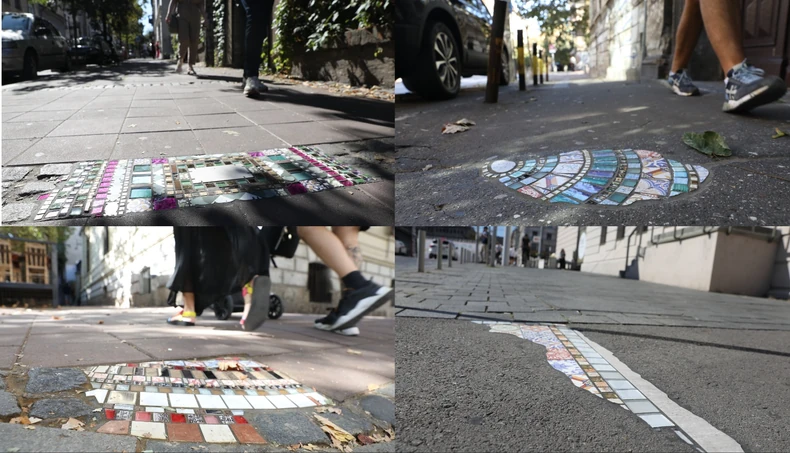 Ovakve mozaike on pravi na mestima gde je trotoar popucao ili se među kockama pojavila rupa. Tako da tu umesto rupe imate prelep mozaik.