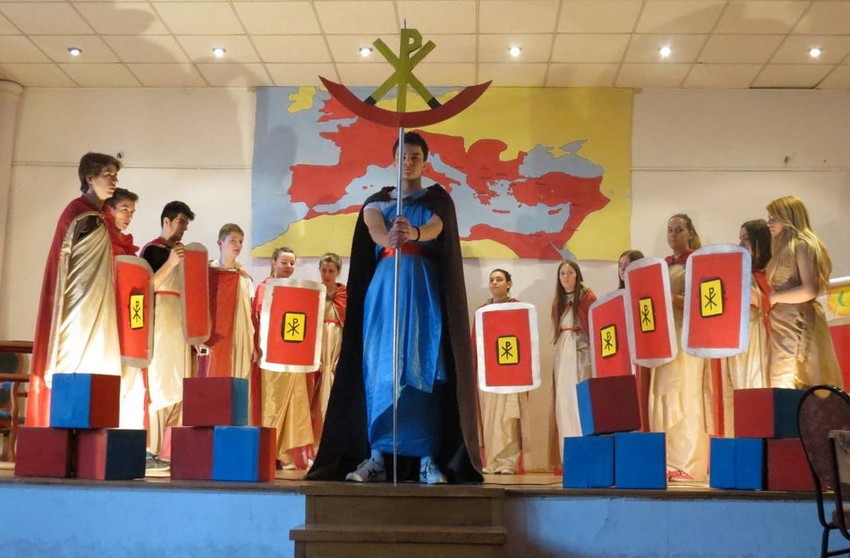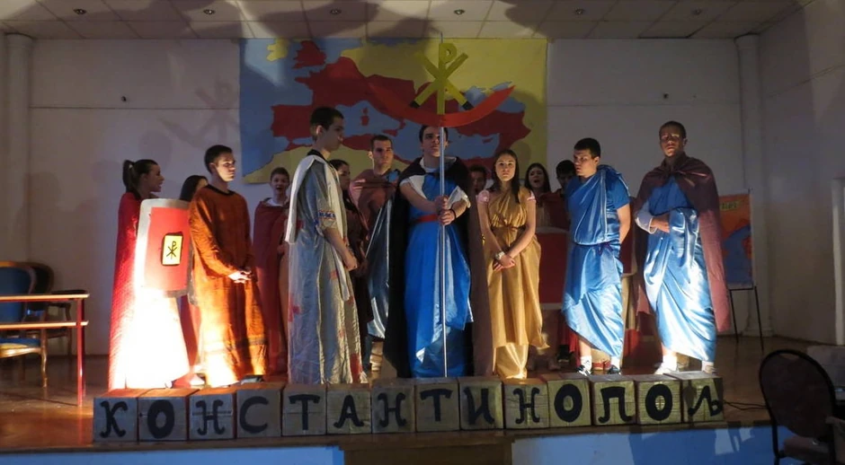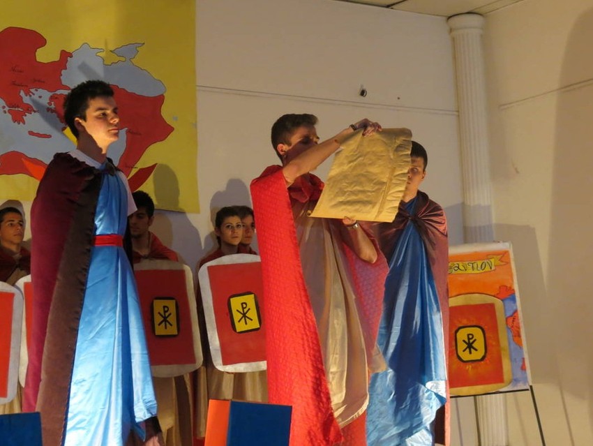 Učenici Osme beogradske gimnazije sinoć su predstavom "Car Konstantin" u svečanoj sali svoje škole obeležili 1.700 godina od izdavanja Milanskog edikta. Predstava je imala i humanitarni karakter, pošto se prikupljao novac za lečenje teško obelele učenice ove gimnazije Aleksandre Živković.