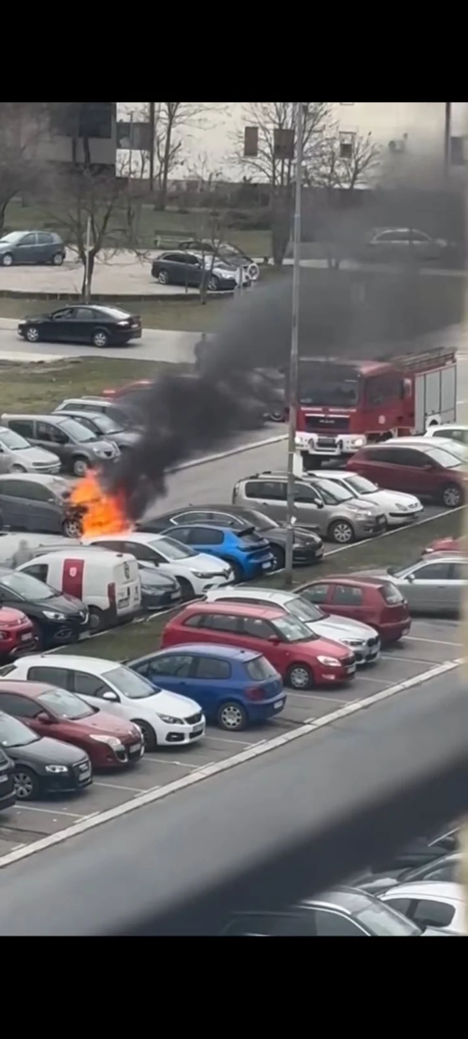 Na punom parkingu iz crnog automobila vatra "kulja" na sve strane, dok se veliki crni dim širi okolo. Nekolicina građana se okupila. Policija je upravo na terenu, a jedno vatrogasno vozilo upravo gasi požar.