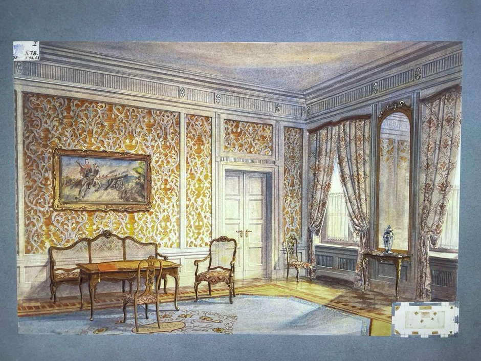 On je precizirao da planovi enterijera Novog dvora sadrže oko 50 akvarela, kao i 80 crteža grafitnom olovkom.