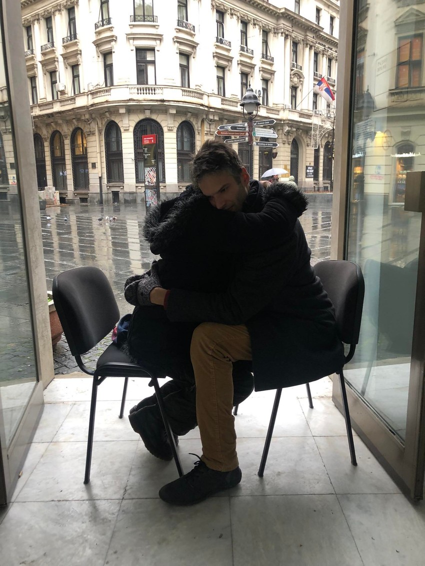 Juče je u centru Beograda započet neobičan performans između dvoje potpunih stranaca. Oni su zagrlili juče nešto posle 14 sati, tako su proveli i celu prethodnu noć, i ostaće zagrljeni sve do danas do 14 časova, tačno, kako kažu 23 sata i 59 minuta!