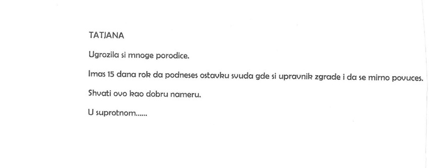 "Tatjana, ugrozila si mnoge porodice. Imaš 15 dana da podneseš ostavku svuda gde si upravnik zgrade i da se mirno povučeš. Shvati ovo kao dobru nameru. U suprotnom…"