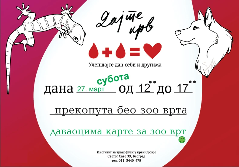 Beo Zoo Vrt, JP „Beogradska tvrđava“ i Institut za transfuziju krvi Srbije organizuju akciju dobrovoljnog davanja krvi u subotu, 27. marta.