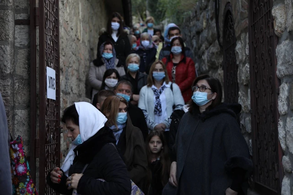 Ko je zaboravio masku, mogao je da je kupi ispred same crkve. Pošto na samu liturgiju nije bilo moguće ući bez maske, a broj vernika unutar crkve je bio ograničen. Flašice sa osveštanom vodom, zbog koje je i došla većina vernika, delila se napolju.