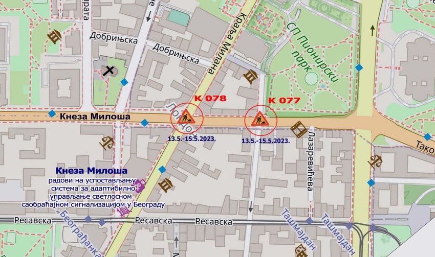 Kneza Miloša – Krunska (K077) od 13. do 15. maja, Kneza Miloša – Durmitorska (K078) od 13. do 15. maja.