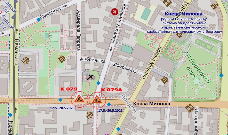 Radovi pod saobraćajem će se obavljati na raskrsnicama: Kneza Miloša – Višegradska (K084) od 8. do 10. maja, Kneza Miloša – Durmitorska (K084A) od 8. do 10. maja.