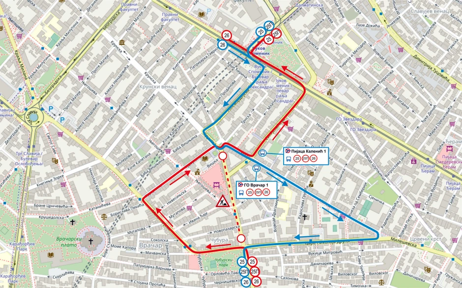 – vozila sa linija 25, 25P, 26 i 26N, u smeru ka gradu, saobraćaće sledećim ulicama: Maksima Gorkog, Cara Nikolaja II, Makenzijevom, Kursulinom, Krunskom, Trnskom, Mileševskom, Sinđelićevom i dalje redovnom trasom.