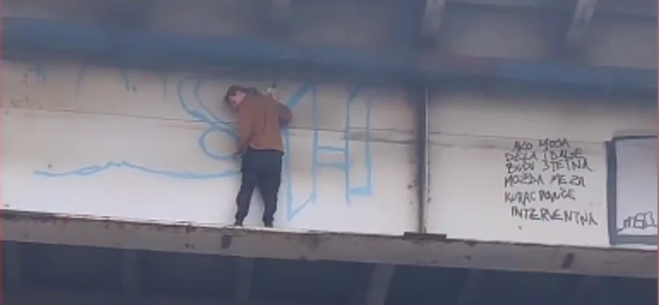 Kako se vidi na snimku, mladić se popeo iznad Brankovog mosta i rizikovao svoj život kako bi nacrtao grafit!