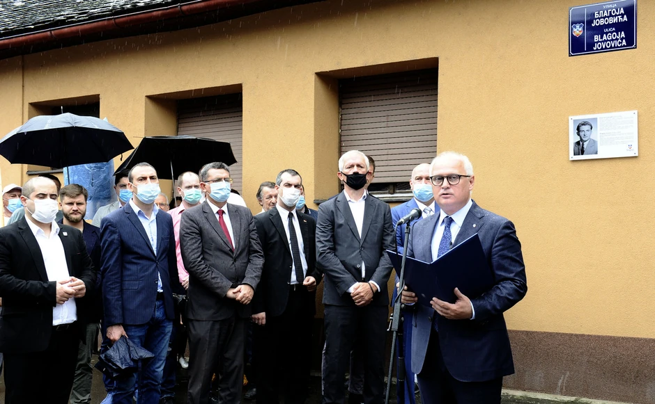 Zamenik gradonačelnika Goran Vesić, ministar za inovacije i tehnološki razvoj Nenad Popović i direktor Muzeja žrtava genocida Veljko Đurić Mišina otkrili su spomen-ploču posvećenu Blagoju Jovoviću u ulici u Zemunu koja je danas zvanično dobila njegovo ime.