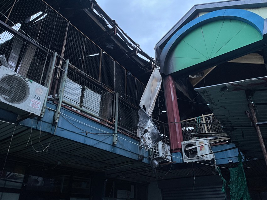 Tu je i dalje ekipa vatrogasaca koja patrolira ispred tržnog centra i po njemu kako planem ne bi opet buknuo.