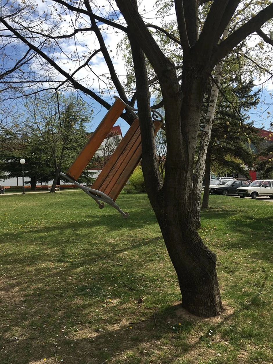 Ćerka jednog sugrađanina prolazila je pored Sportskog centra "Ljubomir Ivanović Gedža" u Ulici Vuka Karadžića i među granama drveta videla nesvakidašnji prizor, pa ga je i fotografisala. Naime, huliganima nije bilo dovoljno samo da iščupaju klupu već su pomislili da će delovati duhovito ako je i podignu na drvo.