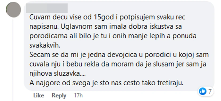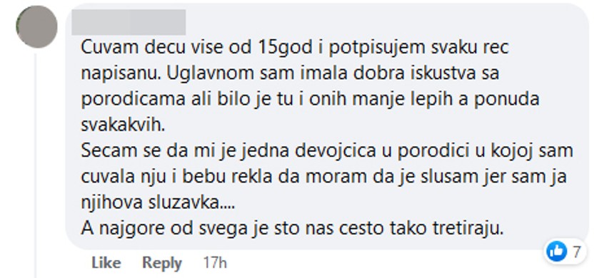 - Na razgovoru mama bebe od pet meseci mi priča šta treba da radim... kuvanje, ribanje, peglanje, ja kažem, a dete? A ona meni: "Pa ja nju dojim, šta biste vi radili sa njom?" Au, pa rekoh, ženo tebi treba kućna pomoćnica, a ne dadilja - navela je dalje ova dadilja u komentaru u kom je podelila svoje iskustvo.