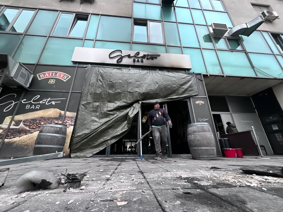 Srča, ostaci inventara i lokala i dalje su vidljivi ispred "Gelato bara". Posledice požara, odnosno vatre vidljivi su i na staklenoj fasadi zgrade u čijem podnožju se nalazi lokal.