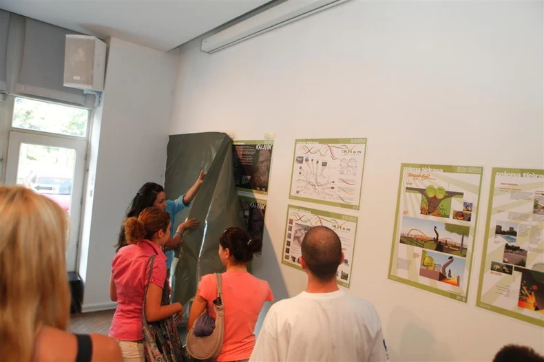 Radovi su bili prekriveni zelenom trakom, koju predstavnici ovog udruženja zovu "zelena trasa". Ona predstavlja plastiku grada, sve ono što je veštačko i neprirodno. Njenim skidanjem su otkriveni radovi zelenih krovova koji su na ovaj način, simbolično nadvladali veštačku strukturu grada.