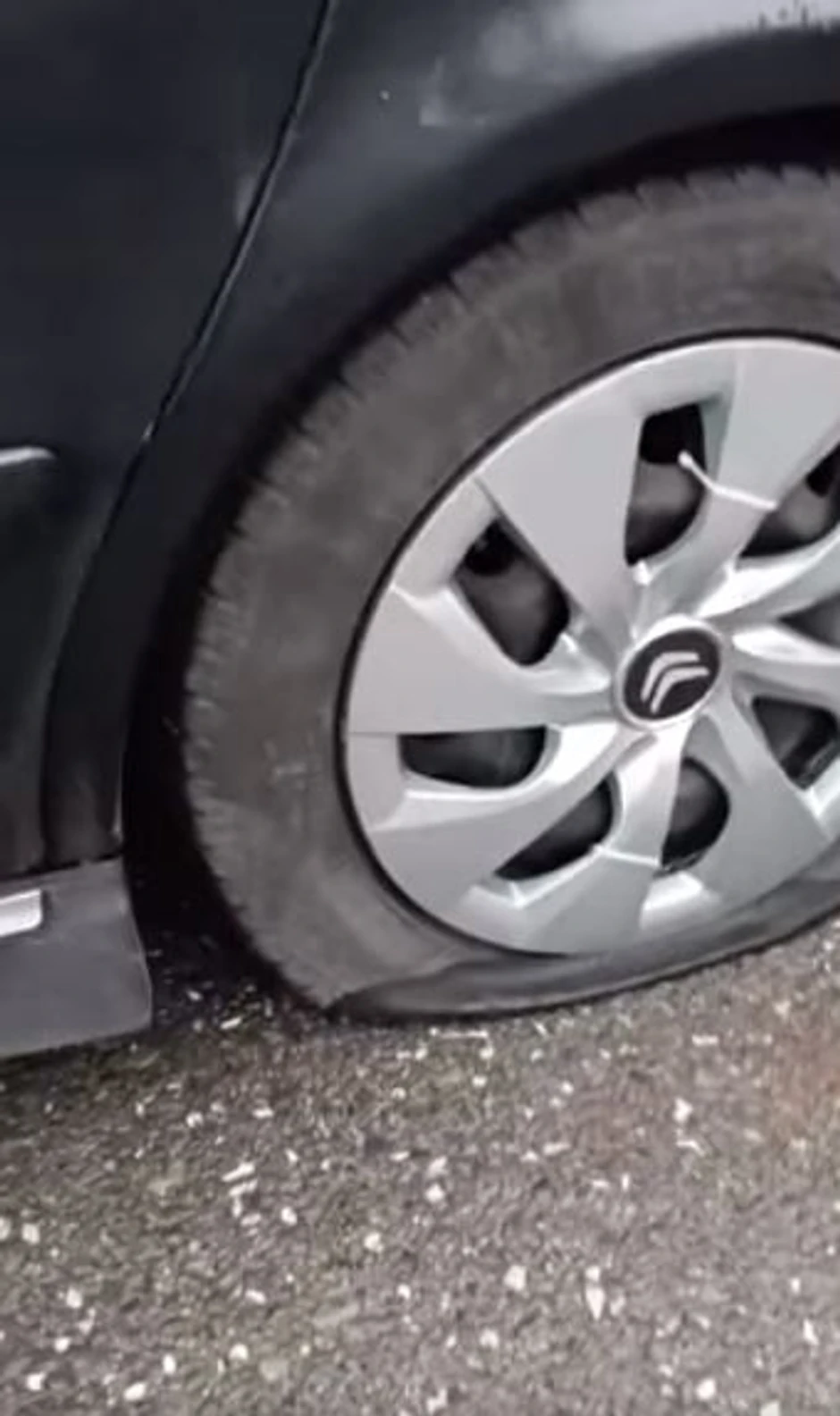 Na snimku se vidi niz parkiranih automobila, svi sa izbušenim svim gumama!