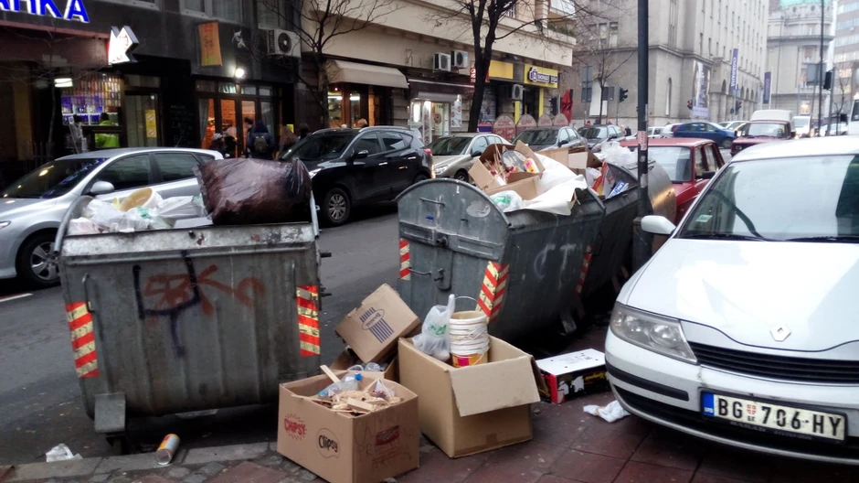 Tik uz ustanovu kulture, Narodno pozorište u centru grada, stoje poređani kontejneri prenatrpani đubretom i kutijama rasutih oko njih, prizor je koji su reporteri "Blica" zatekli u 15 sati.